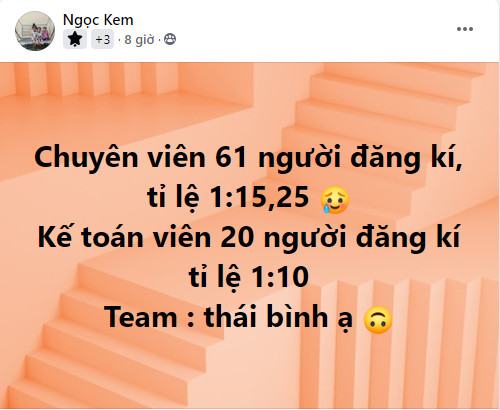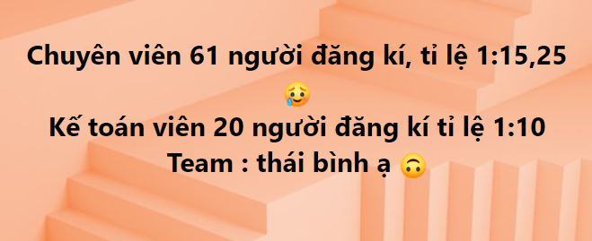 Tỉ lệ chọi thi vào kho bạc nhà nước 2021 Chọi cao thế này thì tỉ lệ rớt cũng nhiều. Rớt nhiều thì số lượng chuyển qua thuế lại đông, tỉ lệ chọi thuế lại cao. Năm ngoái tỉ lệ chọi thuế thấp là vì chỉ tiêu quá nhiều. Các bạn thi thuế đợt tới thì xác định cạnh tranh sẽ nhiều đấy