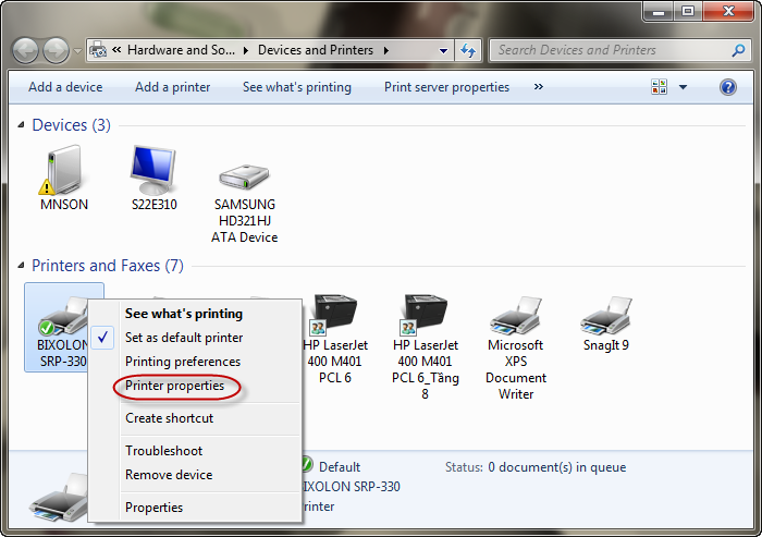 6.2. Nhấn chuột phải vào biểu tượng máy in đang sử dụng, chọn Printer properties.