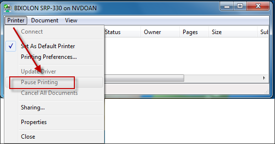 Máy in đang ở chế độ tạm dừng, cần phải bỏ chế độ để thực hiện lệnh in.