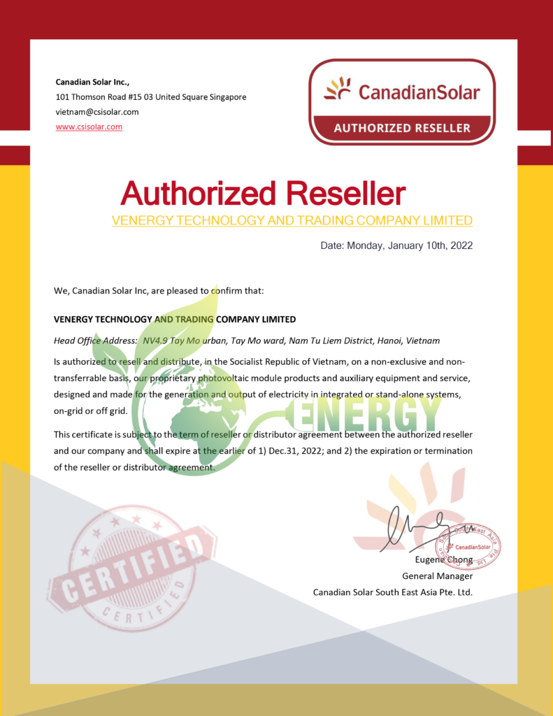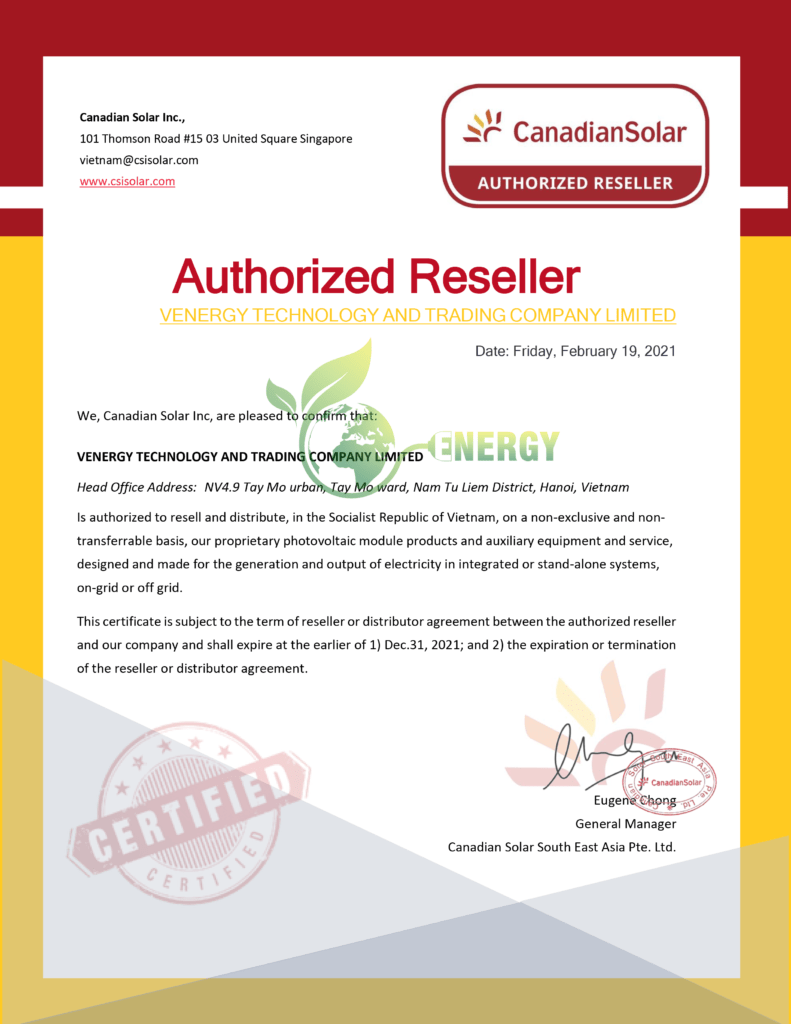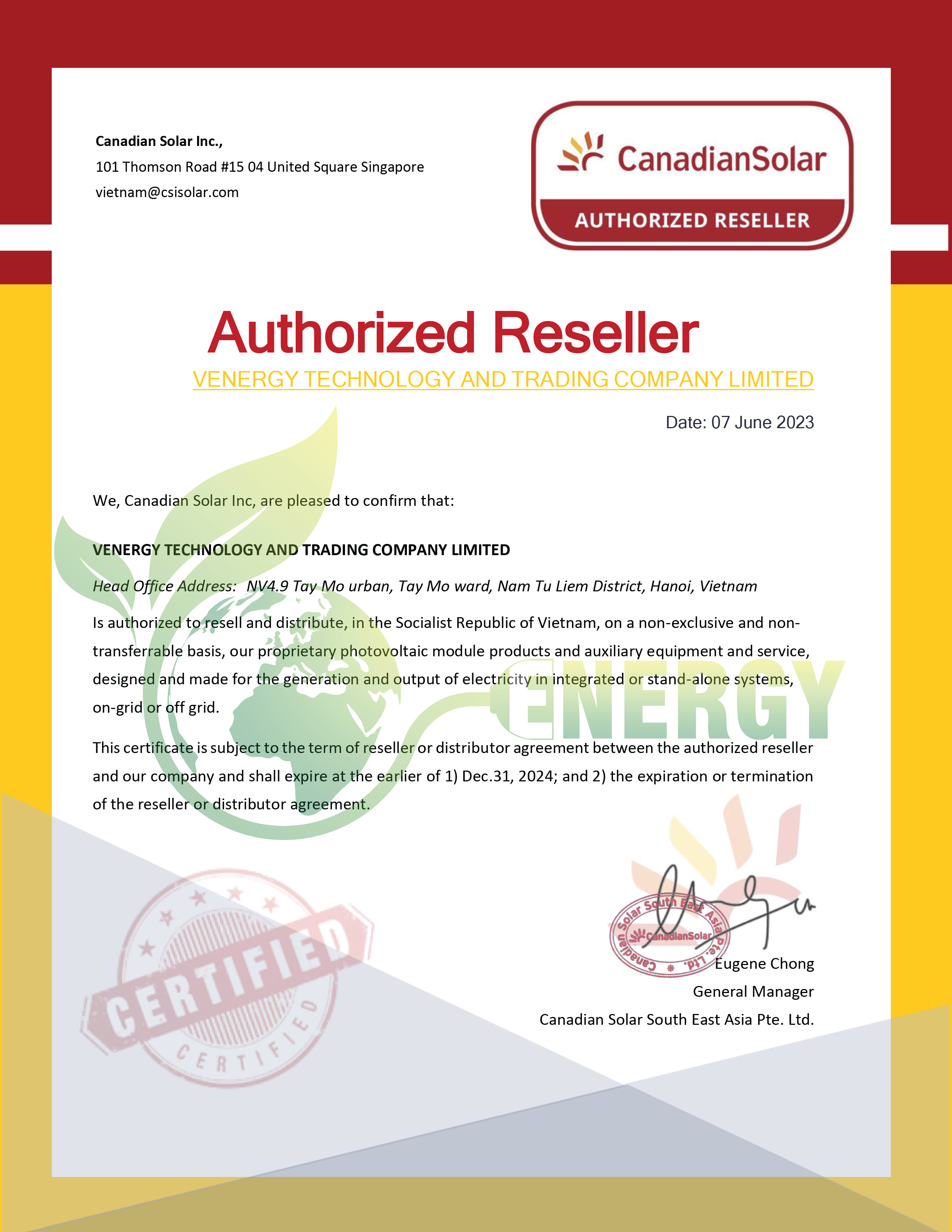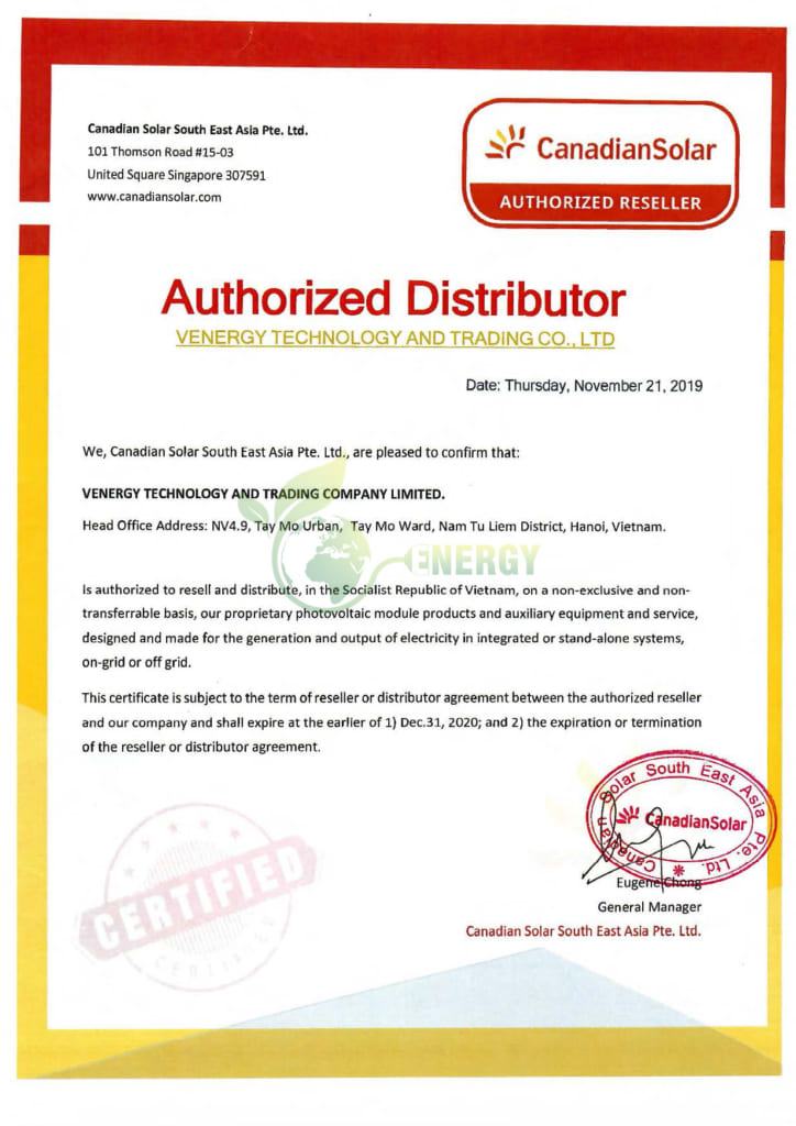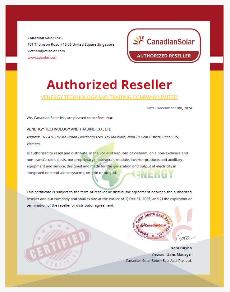 Chúng tôi- VENERGY tự hào trong việc là NHÀ PHÂN PHỐI CHÍNH THỨC sản phẩm pin năng lượng mặt trời của hãng CANADIAN SOLAR tại Việt Nam từ năm 2019, 2020, 2021, 2022, 2023, 2024 và năm 2025.