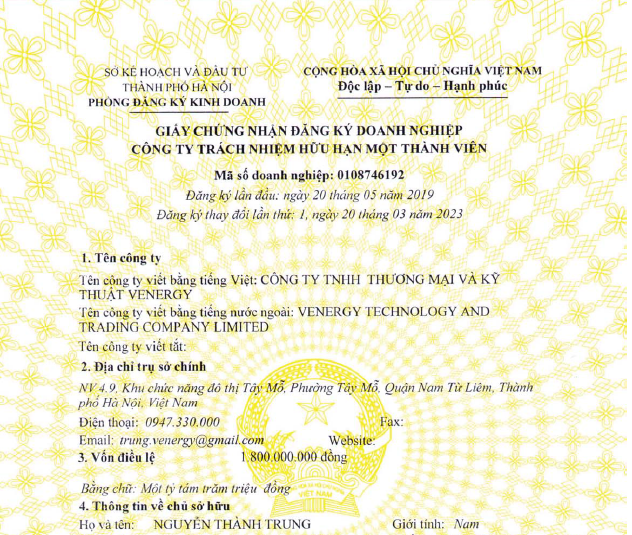 Nhà cung cấp giải pháp điện mặt trời áp mái uy tín, giá rẻ: Công ty TNHH Thương Mại và Kỹ Thuật VENERGY (tên viêt tắt là VENERGY) được thành lập ngày 20/05/2019, có trụ sở chính tại địa chỉ NV 4.9, Khu chức năng đô thị Tây Mỗ, Phường Tây Mỗ, Quận Nam Từ Liêm, TP.Hà Nội.