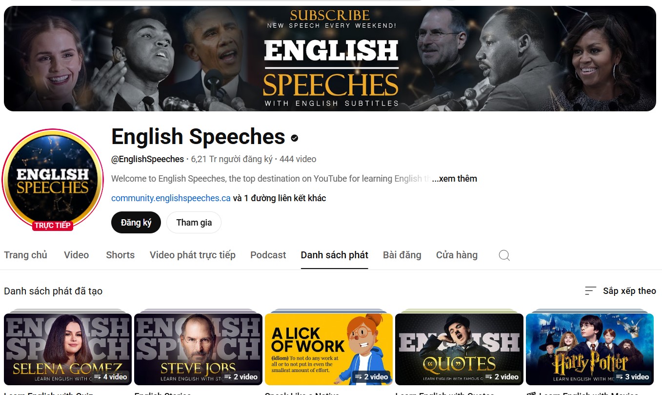 Đều đặn 20 phút mỗi ngày với kênh English Speeches, bạn vừa có thể luyện shadowing, vừa nâng vốn từ, lại vừa nghe được giọng chuẩn Mỹ – Anh… qua những bài phát biểu nổi tiếng.