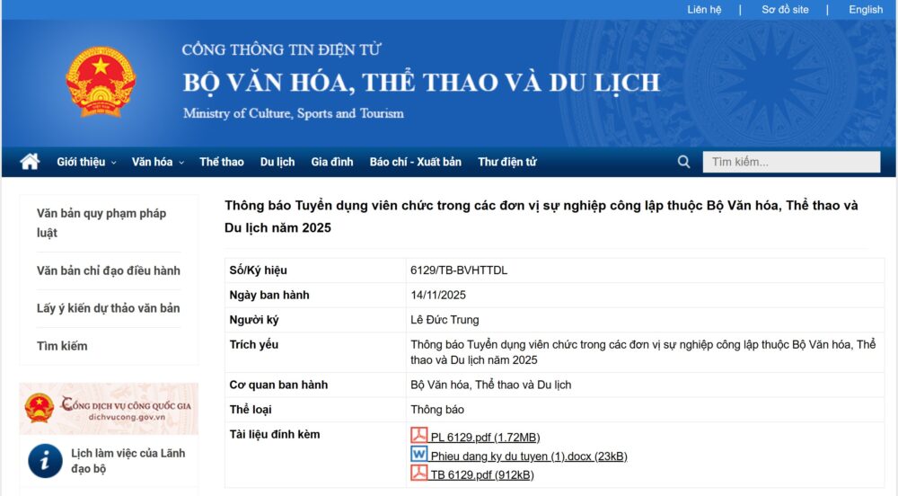 Bộ Văn hóa, Thể thao và Du lịch thông báo tuyển dụng 295 chỉ tiêu viên chức 2025  -Nguồn: https://bvhttdl.gov.vn/van-ban-quan-ly/122422.htm