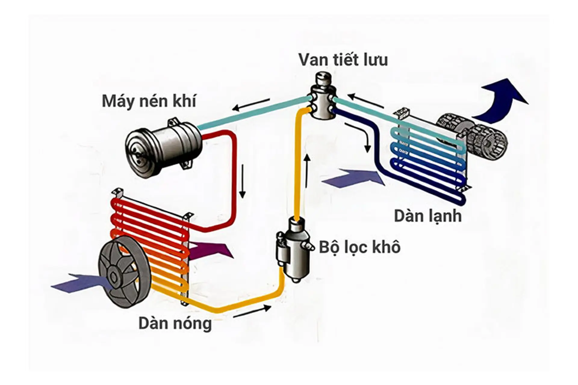 -Gas lỏng áp suất cao đi qua van tiết lưu → bị giảm áp đột ngột → chuyển sang trạng thái lỏng – hơi rất lạnh.