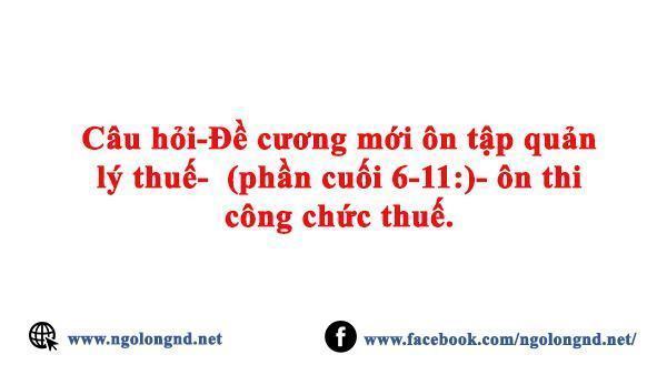 Câu hỏi -Đề cương ôn tập quản lý thuế : Phần cuối 6-11- ôn thi công chức thuế. Gồm nhiều câu hỏi ôn tập có lời giải được ưu tập rất hay.