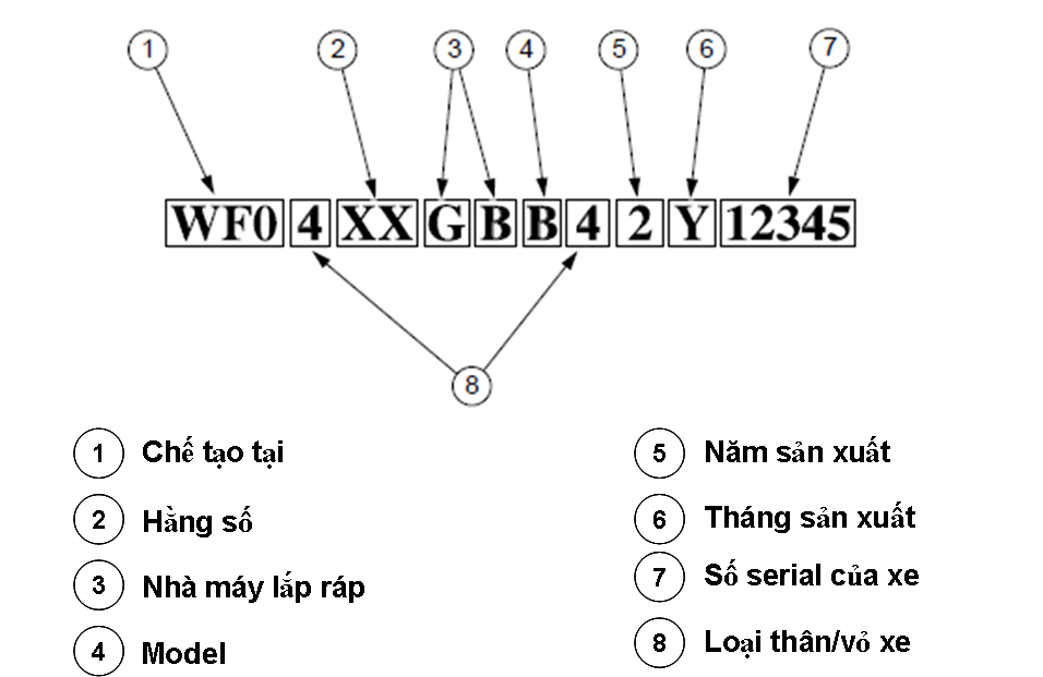 Ký tự thứ 4 đến thứ 8: thể hiện đặc điểm của xe: như loại thân xe, loại động cơ, đời xe, kiểu dáng, …