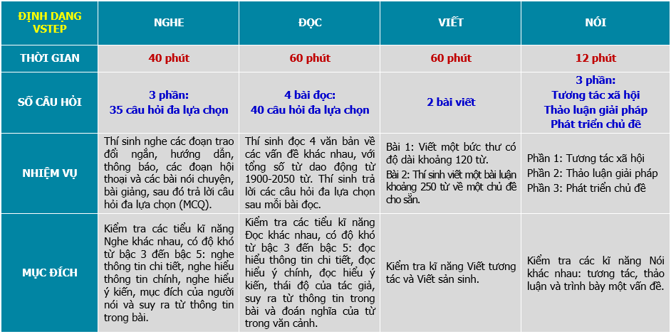 Kỳ thi Vstep đánh giá cả 4 kĩ năng Nghe Vstep listening, Đọc Vstep reading, Viết Vstep writing, Nói Vstep speaking