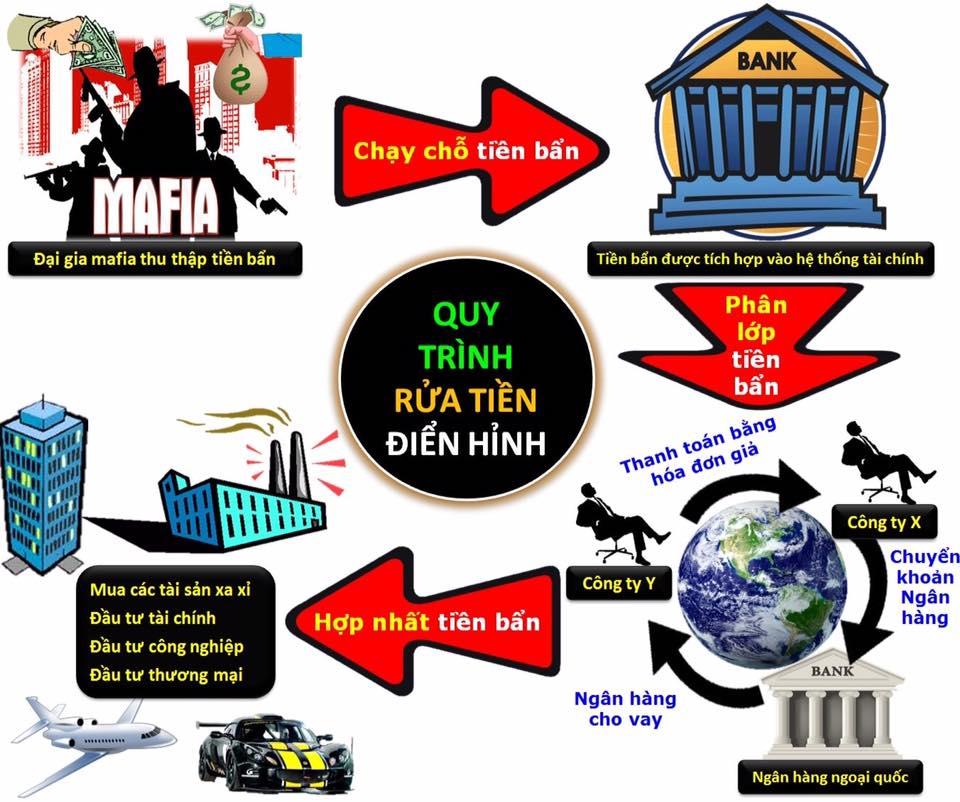 Các thủ đoạn tẩy rửa tiền bẩn ngày càng đa dạng, tinh vi và có tổ chức hơn nhằm “qua mặt” các cơ quan chức năng. Thông thường, tiền được tẩy rửa qua ba bước như sau: