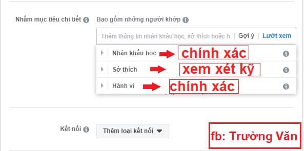 Ưu tiên mục tiêu có sự chính xác cao : Chính xác nhất là hành vi và nhân khẩu học : họ dùng đt gì, truy cập bằng wifi, 4g hay trình duyệt máy tính, có mới mua hàng trên face book hay không… Ưu tiên target cái này trước và cân nhắc kỹ khi target mục sở thích (minh họa ở ảnh 1).