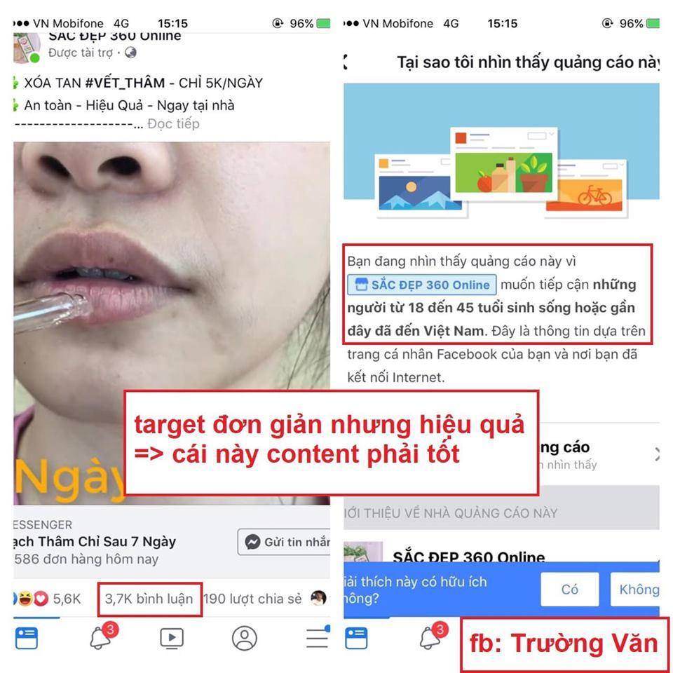 Nhiều trường hợp anh em thấy người ta target rất cơ bản như : Vị trí, Giới tính, Tuổi mà hiệu quả rất cao là do content của họ rất tốt rồi. Thu hút tốt, thuyết phục tốt hoặc biên lợi nhuân nó cao – chạy toẹt ga không sợ bố con thằng nào. Cơ chế phân phối của fb giờ rất thông minh, nó phân phối ngẩu nhiên 500 người đầu và sau đó phân phối tới những người giống những người tương tác với quảng cáo nhất. Nên anh em nào thực sử hiểu sản phẩm, thực sự hiểu khách hàng để tạo ra content tốt thì chạy rất khỏe và hiệu quả, chi lo tối ưu content còn mọi việc để facebook lo. « Content is king” chỉ đúng với người làm được thôi anh em nhé (minh họa ở ảnh 4).
