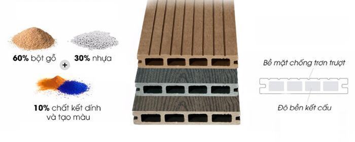 Sàn gỗ nhựa composite ngoài trời là sản phẩm gỗ nhựa (hay còn gọi là gỗ nhựa composite). Sản phẩm có cấu tạo thành phần gồm: cấu tạo từ nhựa PVC, bột gỗ và phụ gia. Trong đó 60% bột gỗ, 30% bột nhựa composite và một số phụ gia khác. Vật liệu được sản xuất dựa trên công nghệ mới nhất hiện nay.